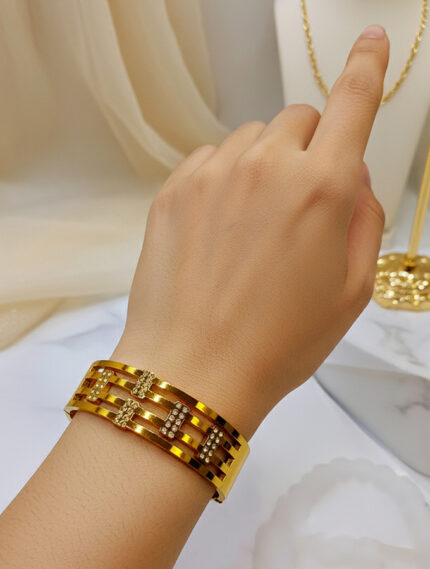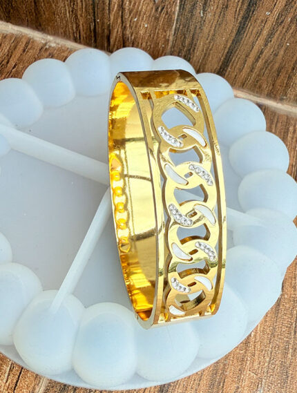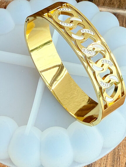 Add a touch of luxury to your collection with this stunning gold-plated bangle. Featuring an intricate chain link design and accented with sparkling crystals, it’s perfect for both everyday wear and special occasions.