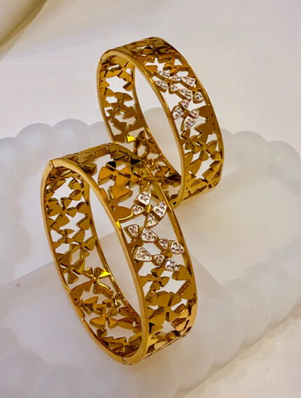 Showcase your style with this elegant gold-plated bangles featuring intricate cutwork and sparkling heart-shaped stone accents. A perfect blend of tradition and glam for any occasion.