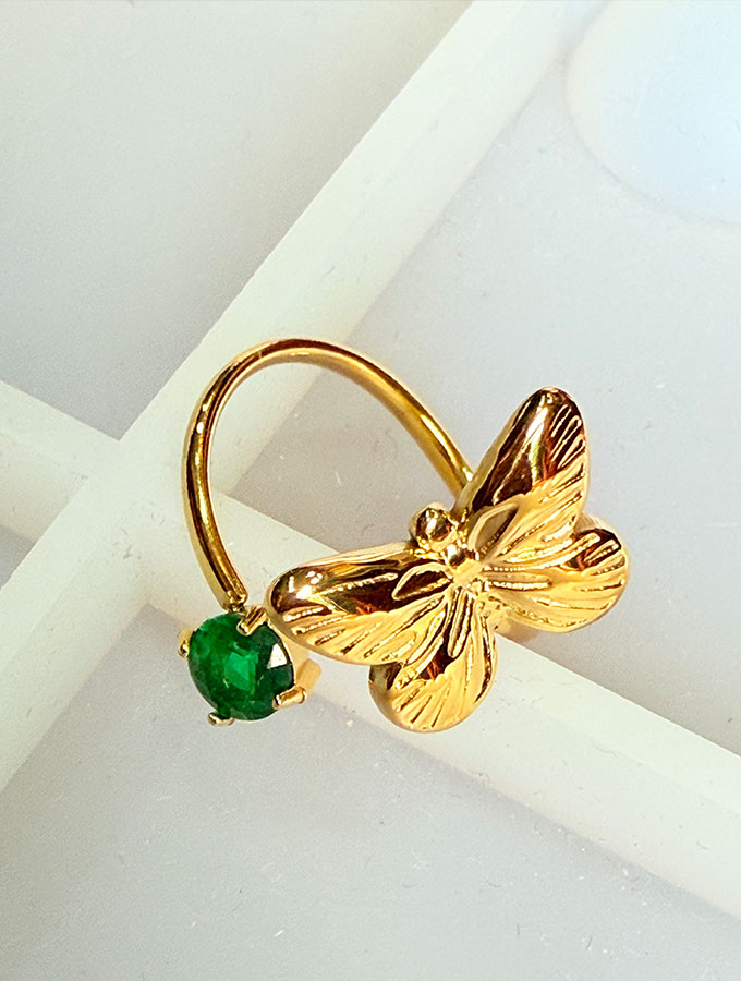 This beautifully crafted butterfly ring is the perfect fusion of nature-inspired design and luxury. Set in a gold-plated band, it features intricately detailed butterfly wings that catch the light with every movement. The ring is adorned with a stunning emerald gemstone, adding a pop of color and an elegant touch to this charming piece. Whether you’re dressing up for a special occasion or adding a unique flair to your everyday look, this ring offers an effortlessly chic aesthetic. Ideal for gifting or treating yourself, it’s a must-have for jewelry lovers who appreciate both fine craftsmanship and nature’s delicate beauty.