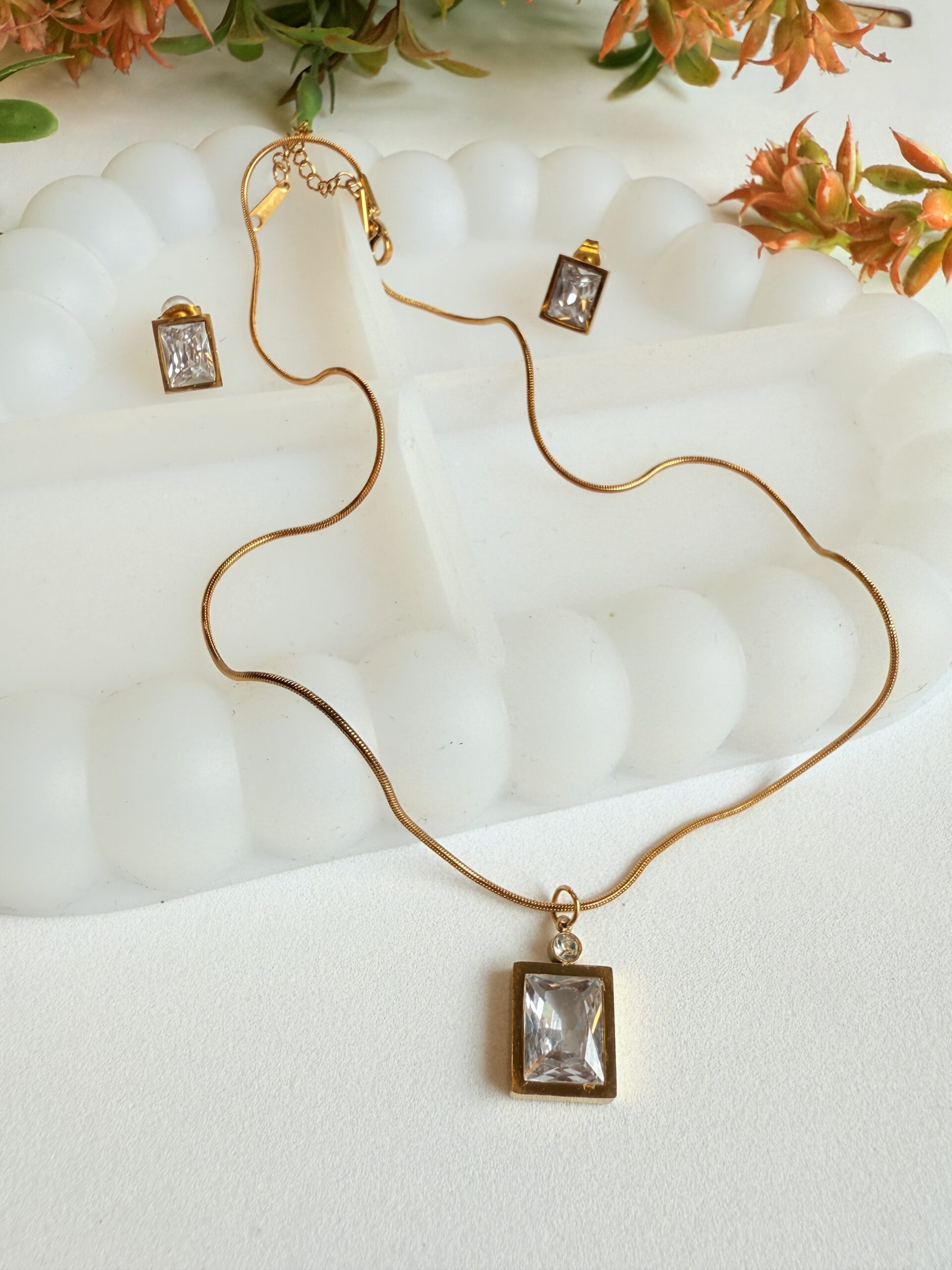 This elegant jewellery set includes a beautifully designed necklace and matching earrings, each featuring a radiant, rectangular clear crystal. The gold-plated finish adds a rich, luxurious touch to the set, making it an ideal accessory for both casual and formal settings. The pendant on the necklace is delicately suspended from a sleek, thin chain, while the stud earrings complete the ensemble with their minimalistic yet striking design.