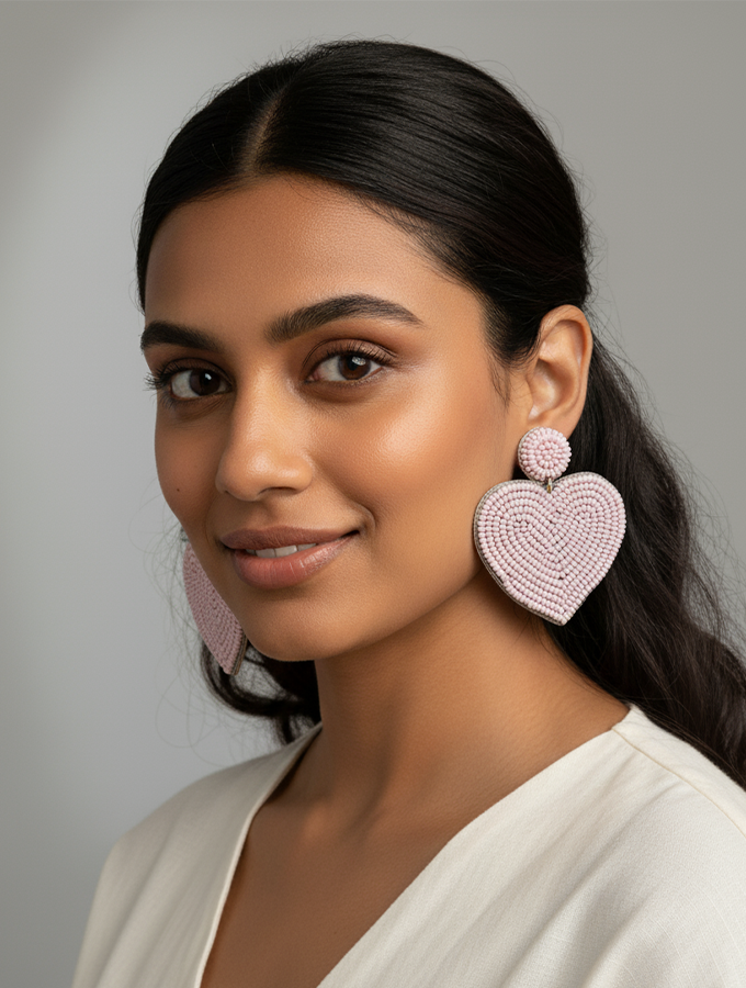 Elevate your accessory game with these stunning pink heart beaded earrings. Made with meticulous attention to detail, these earrings feature an intricate beaded design that forms a graceful heart shape, paired with a circular stud at the top. The soft pink hues add a feminine touch, making them ideal for weddings, parties, or even casual outings.