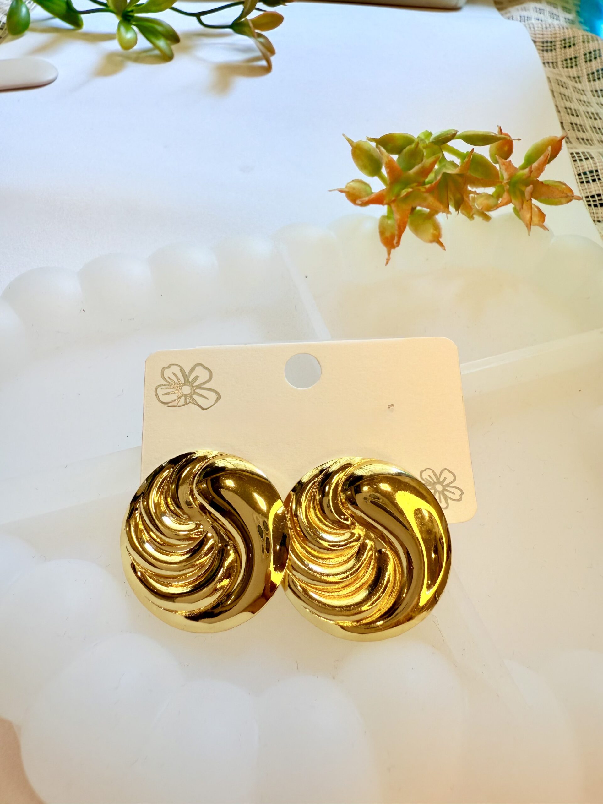 These eye-catching gold earrings feature a bold, circular shape with a unique sculptural swirl design. Polished to a high shine, they make a glamorous statement and are perfect for adding a touch of artistic flair to any outfit.