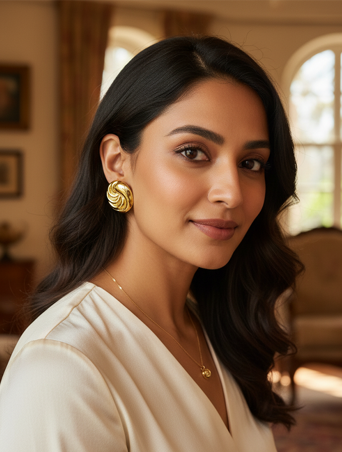 Add a work of art to your jewelry collection with these Sculptural Swirl Statement Earrings. These striking circular earrings are crafted with a radiant gold finish and an intricate, fluid swirl pattern that gives them a dynamic, three-dimensional look. The highly polished surface catches the light beautifully, creating a luminous effect that is both luxurious and elegant.